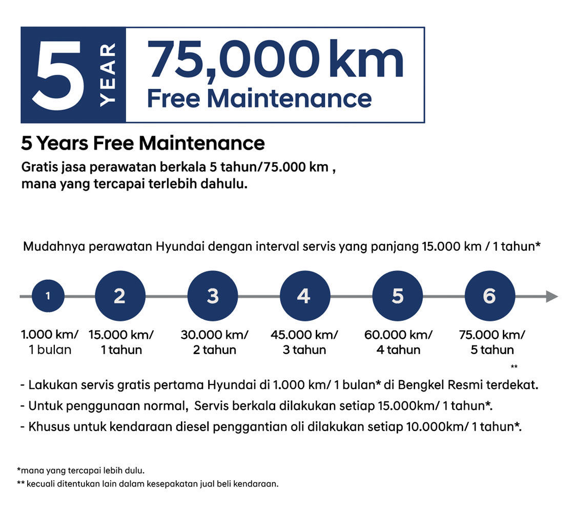 Berlaku untuk kendaraan yang servis di Bengkel Resmi Hyundai atau menggunakan Hyundai Mobile Service.