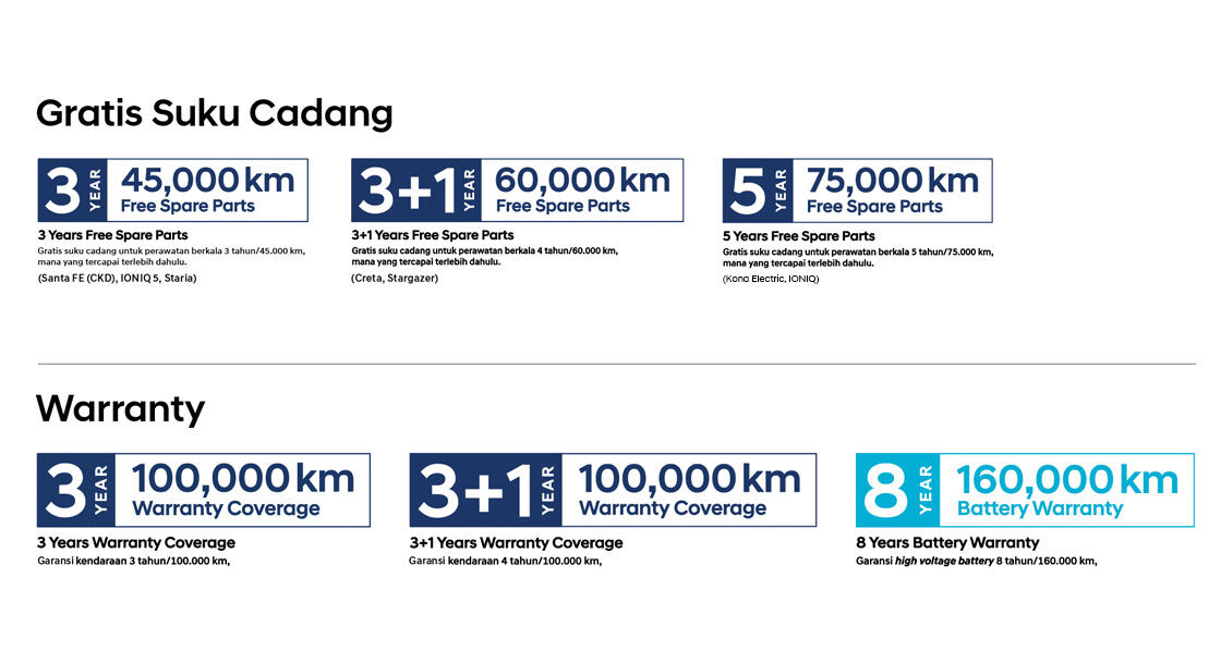 3. Jaminan ini berlaku apabila Hyundai STARGAZER, STARGAZER X, atau CRETA milik pelanggan mengalami kecelakaan lalu lintas yang mengakibatkan kerusakan dengan total biaya perbaikan mencapai minimal 50% dari harga kendaraan.